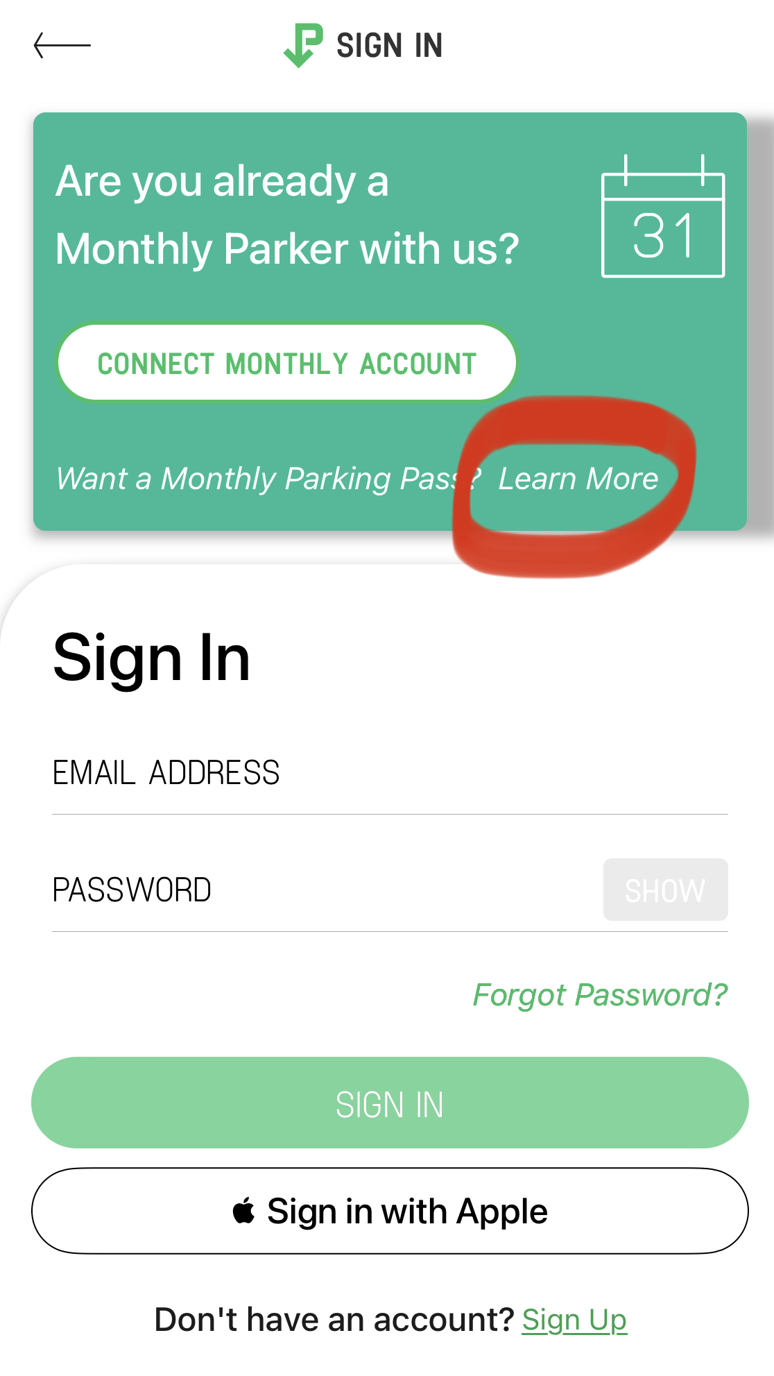- Download the iParkit app from the Apple App or Google Play Store and click ‘sign in.’